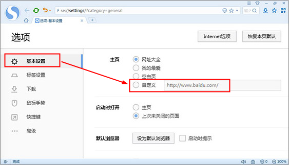 第二步:在主頁選項中,可以自由設置“網址大全”、“我的最愛”、“空白頁”和“自定義”的網址。并且可以選擇啟動時打開“主頁”或者“上次未關閉的頁面”。