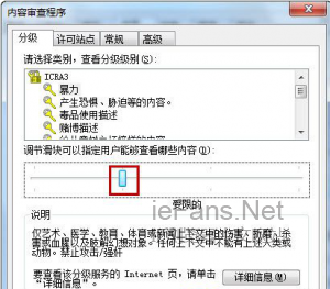 二、之后會彈出一個內容審查程序對話框,然后在他“調節滑塊可以指定用戶能夠查看那些內容的滑塊上面,將其向右拖動,在點擊“確定”按鈕。如圖所示: