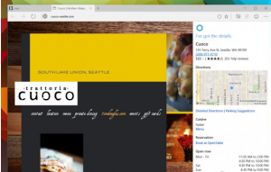 如果你打開了餐館或者零售店的網站,Cortana能夠顯示營業時間、菜單、消費評價、商店所在位置和商店圖片在內的實用信息。所有這些信息都會出現在屏幕的右側,這樣用戶不需要再打開額外的頁面來檢查店家的相關信息。