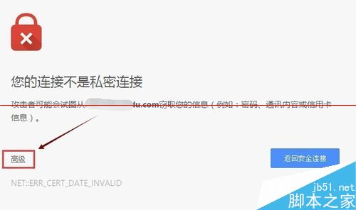2、點擊高級設置后,在您的連接不是私密連接錯誤下面會出現提示說百度的安全證書過期了,或者是計算機時間不對,我們不要管這些,直接點擊下面的“繼續百度的連接(不安全)”就可以了,如下圖所示。