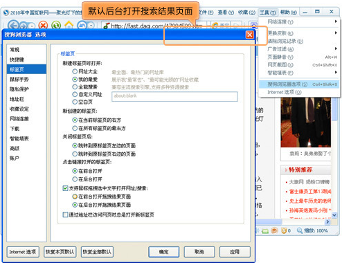 如希望能立刻看到搜索結(jié)果,可在搜狗高速瀏覽器選項(xiàng)中設(shè)置“在前臺打開拖拽結(jié)果頁面”;如不希望在拖拽時自動搜索,也可在搜狗高速瀏覽器選項(xiàng)中關(guān)閉這一功能,設(shè)置方式如下圖所示。