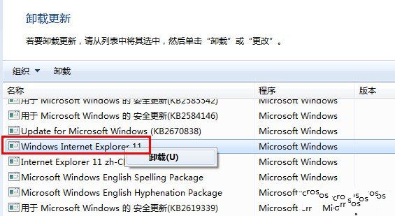 4、找到升級(jí)的IE瀏覽器版本,如我的“Windows Internet Explorer 11”,右擊選擇“卸載”