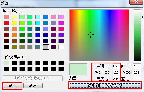 5.選擇色調“85”,飽和度“123”。亮度“205”,選擇“添加到自定義顏色”,點擊“確定”按鈕
