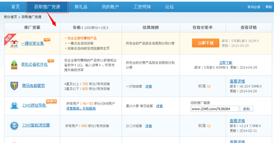 我在圖中標(biāo)注了怎么來賺取積分的方法,點(diǎn)擊上面的“獲取推廣資源”欄,會(huì)進(jìn)入到你可以推廣的資源列表和每個(gè)資源的積分以及注意事項(xiàng)。如下圖