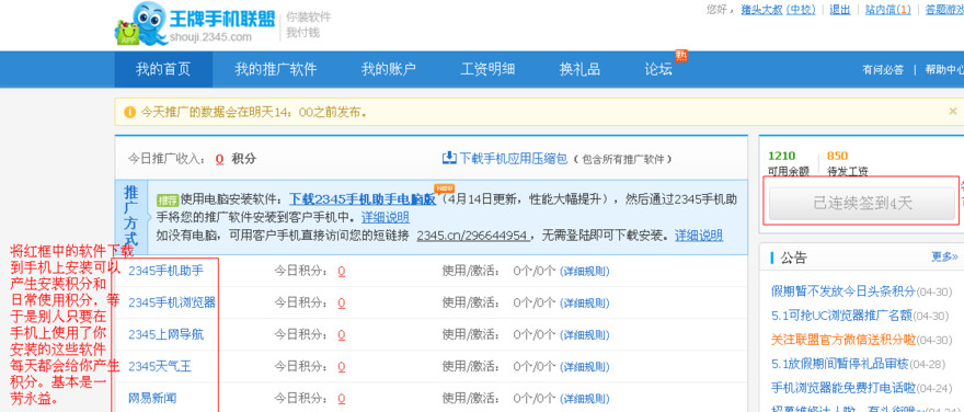 3、手機(jī)聯(lián)盟的方式和這個(gè)差不多,賺取積分的方式也一樣,登錄后點(diǎn)擊上面圖二中的B紅色方框中的“王牌手機(jī)聯(lián)盟”,進(jìn)入的界面如下