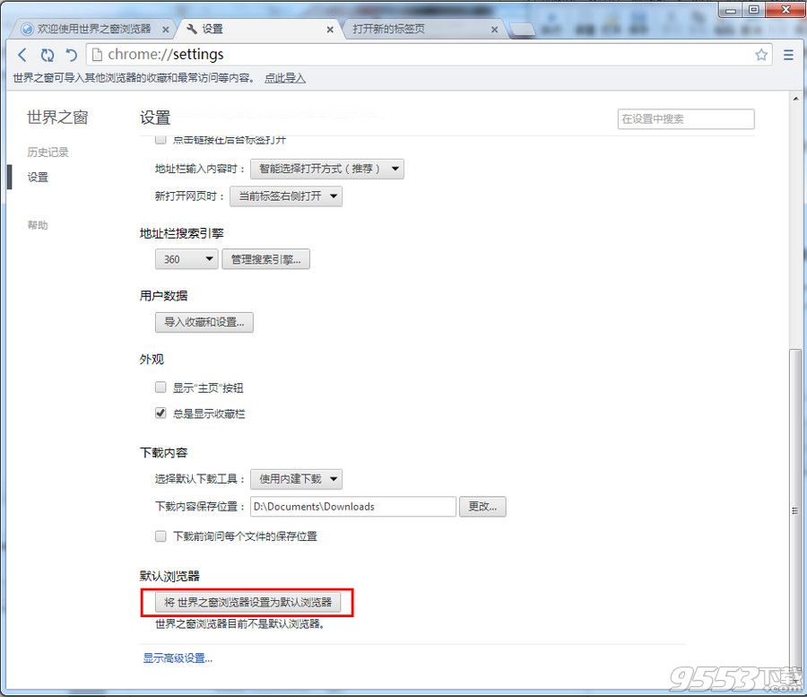 2、然后在設(shè)置中我們可以看到“默認(rèn)瀏覽器”==點(diǎn)擊“將世界之窗瀏覽器設(shè)置為默認(rèn)瀏覽器”