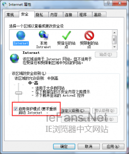 4、然后在Internet屬性窗口中,切換到“安全”標簽頁,將“啟用保護模式”前面的勾選去掉,點擊確定即可。