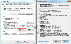 3、關閉網頁之后,點擊“Internet”屬性,在“常規”標簽頁中點擊瀏覽歷史記錄中的刪除按鈕,在彈出來的窗口中將所有可以刪除的項都勾選上,點擊確定刪除;