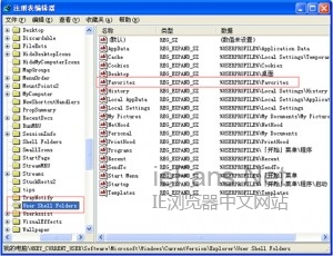 再打開的注冊表編輯器里面選擇HKEY_CURRENT_USER—Software—Microsoft—Windows—CurrentVersion—Explorer--User Shell Folder,如圖,