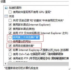 第二種方法:禁用IE11第三方瀏覽器擴展的功能,啟用自動崩潰恢復功能