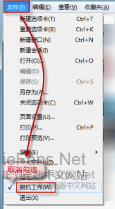 上述標記暗示了IE瀏覽器正處于脫機工作狀態。在菜單欄中。打開“文件”下拉菜單,有個“脫機工作”選項,查看一下,“脫機工作”是否有被勾選,如果有,請取消勾選。如圖: