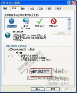 2、接著,選擇“安全”頁面,點擊“Internet”,再選擇下面的“自定義級別”按鈕。