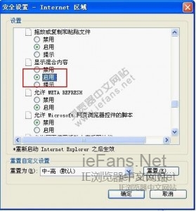 3、將“顯示混合內容”項缺省的“提示”改成“啟用”,問題即可解決。
