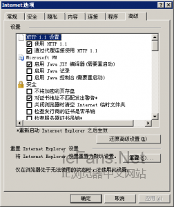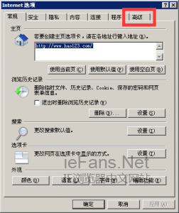 2、“Internet選項”中,點擊右上角的“高級”的選項卡,瀏覽器的重置按鈕在這里;