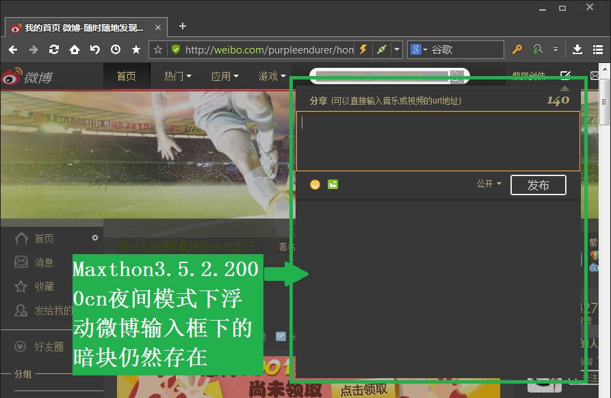 Maxthon3.5.2.2000cn夜間模式下浮動微博輸入框下的暗塊仍然存在
