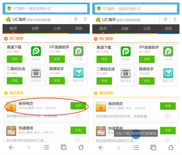 這下就到了UC插件中心來了,這里有許許多多的插件,可以幫助用戶更好的使用瀏覽器。而保存網頁就在首頁精品推薦的第一個啦!選擇“安裝”。