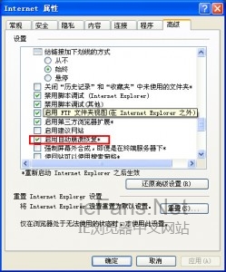 2、進(jìn)入到“Internet選項(xiàng)”設(shè)置頁(yè)面后,移動(dòng)到“高級(jí)”,在下面的設(shè)置中找到“自動(dòng)崩潰恢復(fù)”并勾選它。