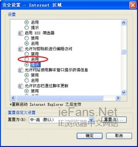 3、在“自定義級別”里面找到“允許對剪貼板進行編程訪問”,將默認的“提示”修改為“啟動”然后點擊“確定”按鈕,出現提示“確實要更改該區域的設置嗎?”,點擊“是”就OK了。