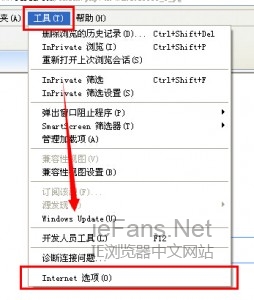 1、打開IE8瀏覽器,點擊“工具”在彈出的下拉框中找到“Internet 選項”。