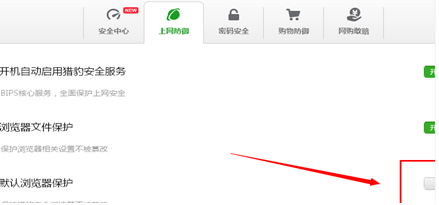b) 在安全中心頁面點擊“上網(wǎng)防御”——檢查瀏覽器保護是否是開啟狀態(tài),如果是開啟狀態(tài),請關(guān)閉后重新設(shè)置瀏覽器為默認瀏覽器。