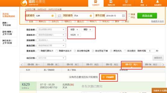 3、點擊查詢余票后如圖所示,用戶選擇的9月13日K629次北京-天水列車已經(jīng)無票,此時點擊系統(tǒng)自動顯示的刷票鍵鈕,系統(tǒng)將自動刷票: