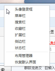 5.0的主要功能按鈕差不多都在這里了,其中“隱藏的菜單”“擴(kuò)展工具”“賬戶登陸同步”這三個圖標(biāo)按鈕,是在沒有打開菜單欄、擴(kuò)展欄、頭像框的狀態(tài)下才會顯示,右鍵點(diǎn)擊瀏覽器頂部空白處,就會出現(xiàn)以下彈框,你需要打開什么欄目,就直接勾選。