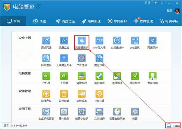 第一步:打開電腦管家——點擊工具箱——點擊瀏覽器保護