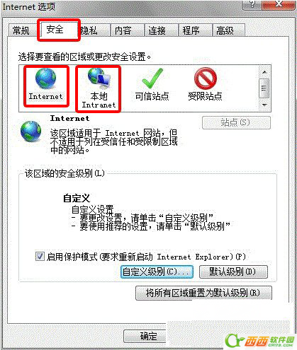 2. 在Internet選項中選擇“安全”選項卡,其中安裝級別設置包括“Internet”和“本地Internet”,其中“Internet”安全設置 適用于Internet網(wǎng)站,但不適用于列在受信任和受限制區(qū)域中的網(wǎng)站;“本地Internet”中的安全設置 適用于在您的Internet上找到的所有網(wǎng)站;