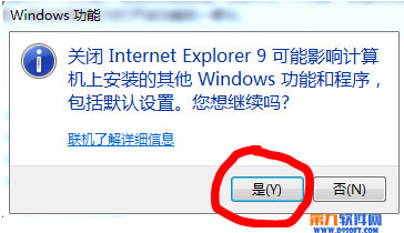 6、確定后,系統會自動關閉IE瀏覽器,如果想要恢復的話,只需要按照上述步驟,將“Internet Explorer 9”前的方框打上對鉤即可。