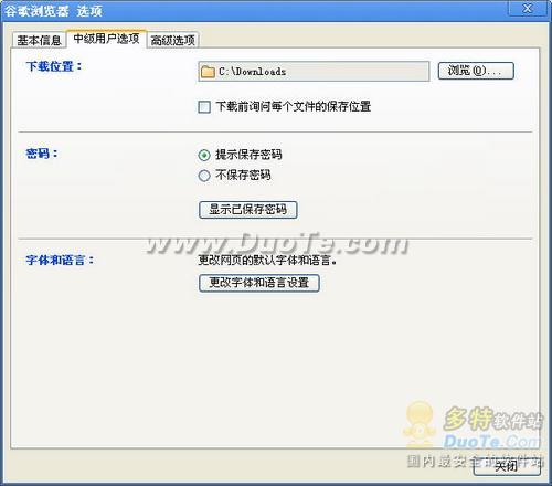 “中級用戶選項”中可以設置下載位置、密碼、字體和語言。