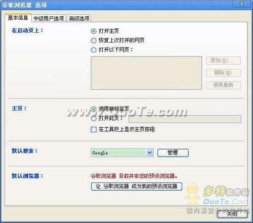 “基本信息”選項中可以設置啟動頁、主頁、默認搜索和默認瀏覽器。