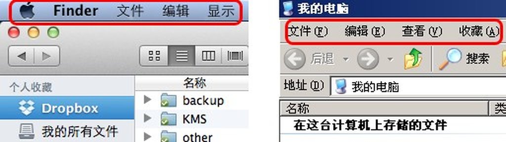 2.目標的大小。位于頂部的Tab欄其實是對Fitts定律的靈活運用,由于光標不可能跑出屏幕以外,因此用戶盡可以隨便將光標向上移動,光標肯定位于Tab欄上(Tab欄呈條狀展現更易被選中),這降低了光標指向的難度,節約了用戶時間。我們可以看一個更有名的例子,Apple的應用程序menu bar與Windows的應用程序menu bar對比,Windows一直以來的UI設計都是把menu bar放在應用程序的title bar下面,而OSX採取完全不同的設計,把menu bar固定在螢幕最頂端(注意下圖紅色框起來的部分)。一般人對這兩種設計沒有太多觀感,但當我們應用Fitts定律后,會發現OSX把menu bar放在屏幕最頂端,雖然移動距離變長了,但目標的大小也跟著變成了“無限大”。