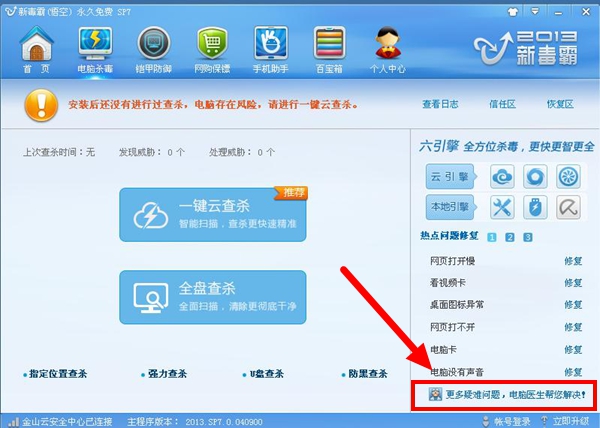 1,打開金山毒霸界面,切換到電腦殺毒界面,點擊箭頭指向的===更多疑難問題,電腦醫生幫您解決