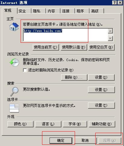 3,進入主頁修改界面,我們輸入自己喜歡的網頁比方www.baidu.com ,然后點擊應用--確定即可。重啟啟動IE瀏覽器