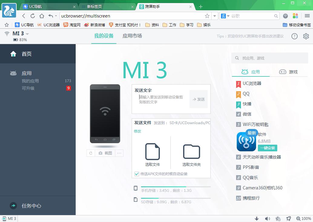 UC瀏覽器電腦版的一大亮點是可以直接和手機互動。使用云同步,不同設備間輕松同步標簽、書簽和個性設置,一個UC賬號就能搞定;使用跨屏助手,連接手機和電腦等多設備,用戶能夠在電腦上管理手機,一鍵實現文字、文件互傳,應用安裝管理等操作。為了讓手機等移動設備更好地和電腦互動,UC瀏覽器電腦版還自帶免費Wi-Fi功能,讓電腦變成路由,讓手機隨時隨地使用Wi-Fi。為了讓用戶上網更自由,UC瀏覽器電腦版的“紅杏出園”功能可以突破限制,輕松訪問企業/校園局域網屏蔽站點,讓原本無法連接的網站都可以順利訪問,瀏覽更加暢快。