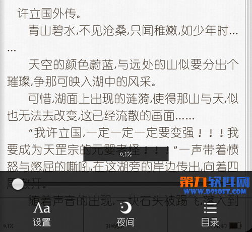 點擊返回或者點擊小說閱讀器可以進入書籍列表,點擊具體的書籍可以直接進行閱讀。這里面的功能和大多數的閱讀器相差不大,夜間模式,劃詞分享,生成目錄,字體大小,都可以支持!