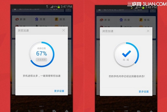 2、在插件面板找到"瀏覽加速"插件點擊打開,在彈出的功能框按下"點擊加速",這時你的手機小伙伴就進入"減肥狀態",顯示完成就說明"瘦身"成功啦~