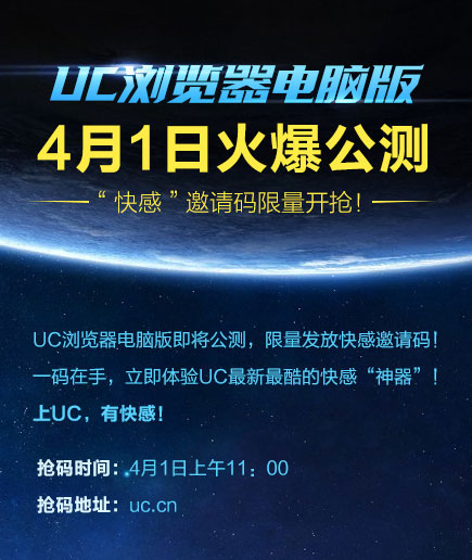 4月1日是愚人節,同時在這一天,UC瀏覽器電腦版正式登陸地球,巔峰快感,極速來襲,今天上午11點鐘,UC瀏覽器電腦版將限量發放公測邀請碼,一碼在手,立即體驗UC最新最酷的快感“神器”,需登錄UC賬號才能搶碼哦,趕緊來搶吧。