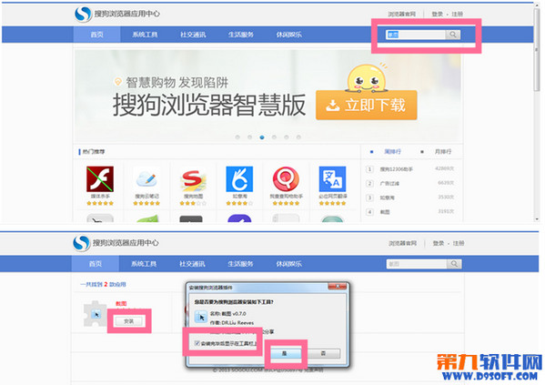 3.在搜狗瀏覽器應用中心界面搜索“截圖”再點擊“安裝”在彈出的安裝完畢后顯示在工具欄上選擇“是”。