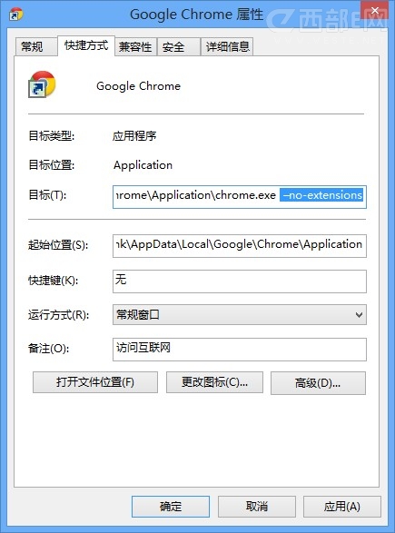 打開“安全模式”的方法:右鍵單擊任務(wù)欄上的Chrome圖標(biāo),選擇屬性。在目標(biāo)的后面加上 –no-extensions(雙段橫線開頭),然后點擊確定。然后關(guān)閉所有Chrome瀏覽器,使用這個圖標(biāo)快捷鍵打開。
