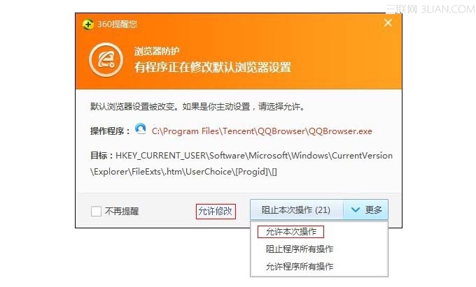 ),在設置QQ瀏覽器為默認瀏覽器時,會有一個提示彈框,請選擇“允許修改”即可。