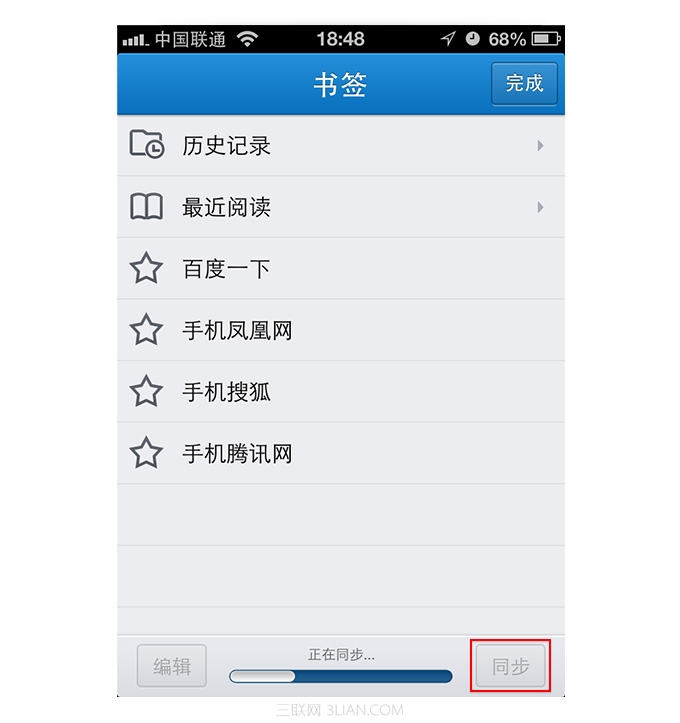 登錄手機QQ瀏覽器,在“書簽/歷史”中,單擊同步按鈕(如下圖),然后在PC的QQ瀏覽器上等待2分鐘,就能同步獲取到手機上更改后的書簽內容。