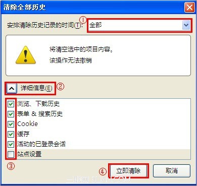 “安排清除歷史記錄的時間”選擇“全部”,點擊“詳細信息”,勾選“瀏覽、下載歷史”“表單 & 搜索歷史”“Cookies”“高速緩存”和“活動的已登錄會話”,最后點擊“立即清除”即可。