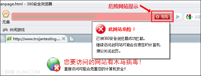 另外,當您訪問的網站是木馬網站或者欺詐網站時,該地址欄會變紅、銘牌顯示“危險”,避免因為訪問這類網站造成損失。