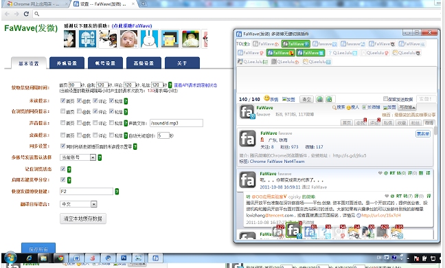 發(fā)微(FaWave),Chrome上的微博插件,支持多微博,真正的實時同步發(fā)送微博,多微博發(fā)送不再煩。目前支持的微博有騰訊微博(qq)、新浪微博 (sina)、搜狐微博(sohu)、飯否、做啥、嘀咕(digu)、人間網(wǎng)、雷猴、豆瓣、Google Buzz、網(wǎng)易微博(163)。 功能全面、強(qiáng)大,還可以批量發(fā)送圖片