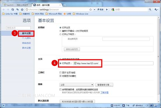 2、基本設(shè)置-打開此頁里輸入 http://www.hao123.com/ ,寬屏版為 http://www.hao123.com/indexk.html 。