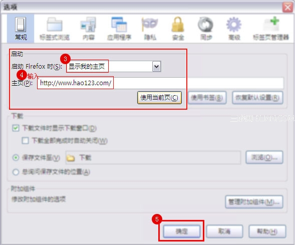 2、選擇常規,依次選擇顯示我的主頁;輸入http://www.hao123.com/主頁地址,點擊使用當前頁按鈕。最后點擊確定就可以了。