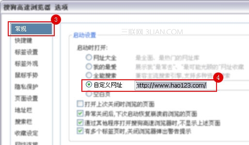 2、選擇常規(guī)選項, 在啟動設置里選擇自定義網(wǎng)址,并輸入http://www.hao123.com/ ,點擊確定,就可以設定hao123為主頁了。
