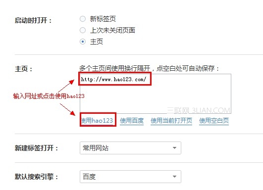2、在瀏覽器啟動時打開(主頁設置) 內輸入 http://www.hao123.com/ 后,關閉即可。