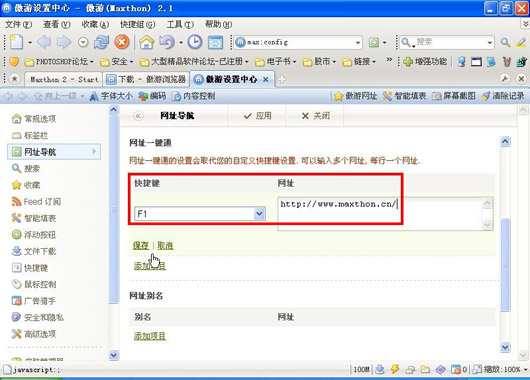 將打開的“傲游設置中心”頁面切換到“網址導航”子頁面,在其中的“快捷鍵”項目里,用戶可以分別賦于F1—F12這12個快捷鍵各自對應一個網址,如筆者將F1快捷鍵自動匹配的網址定義為http://www.maxthon.cn/,則以后只要在瀏覽器頁面中輸入快捷鍵F1,則傲游瀏覽器就會立即自動打開http://www.maxthon.cn/,既方便又快捷(如圖4)。